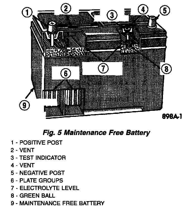 Maintenance-free batteries have non-removable battery vent caps (Fig. 5). Water cannot be added to this battery. Under normal service the composition of this battery reduces gassing and water loss at normal charge rates. If the battery electrolyte level becomes low, this battery must be replaced.