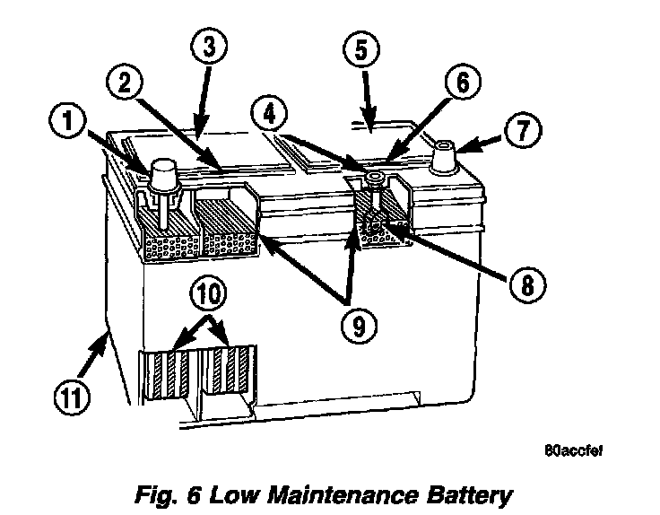 Low-maintenance batteries have removable battery cell caps (Fig. 6). Water can be added to this battery. Under normal service the composition of this battery reduces gassing and water loss at normal charge rates.