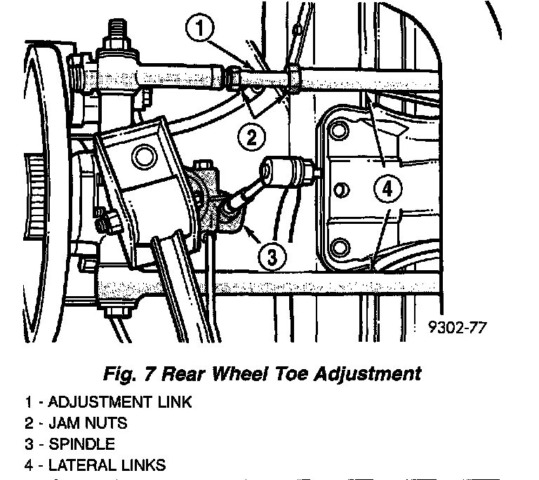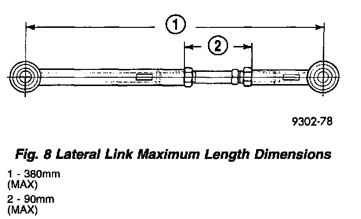1. Loosen lateral link, adjustment link jam nuts. Rotate adjustment links as required to set rear wheel Toe to specifications. Do not exceed the maximum length dimensions of the lateral links shown in. Both dimensions must be checked to ensure they do not exceed maxi