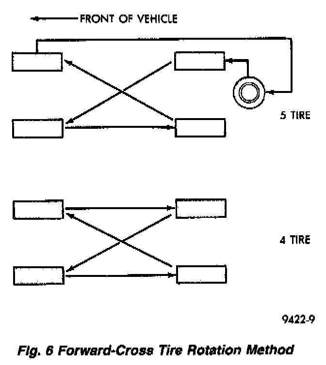 The suggested rotation method is the forward-cross tire rotation method. This method takes advantage of current tire industry practice which allows rotation of radial-ply tires. Other rotation methods may be used, but may not have all the benefits of the recommended method.