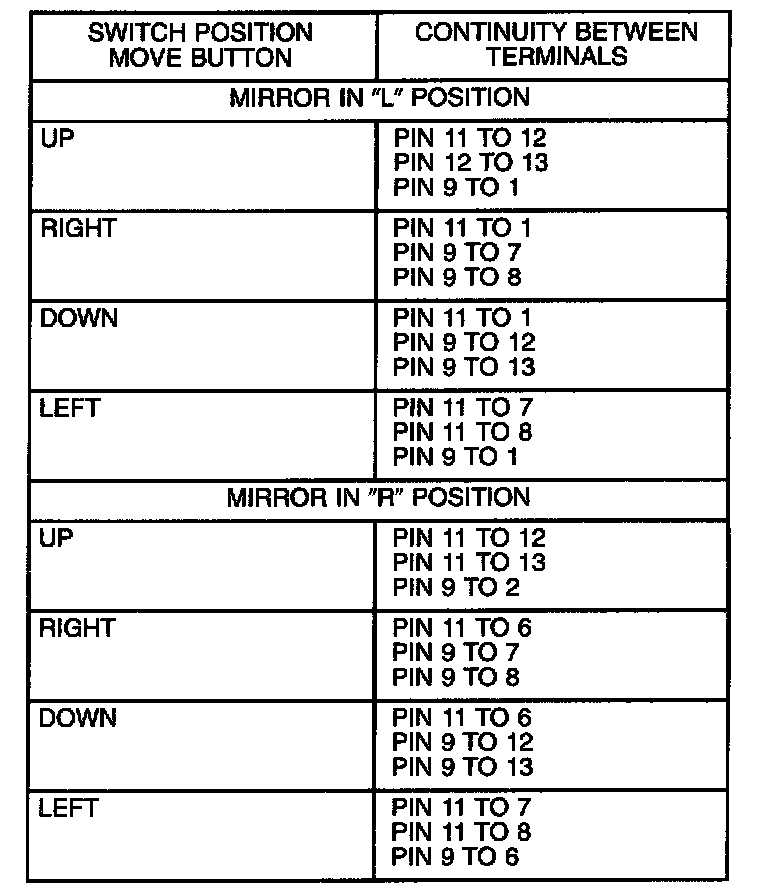 4. Using an ohmmeter, test for continuity between the terminals of the switch as shown in the Mirror Switch Test table.
