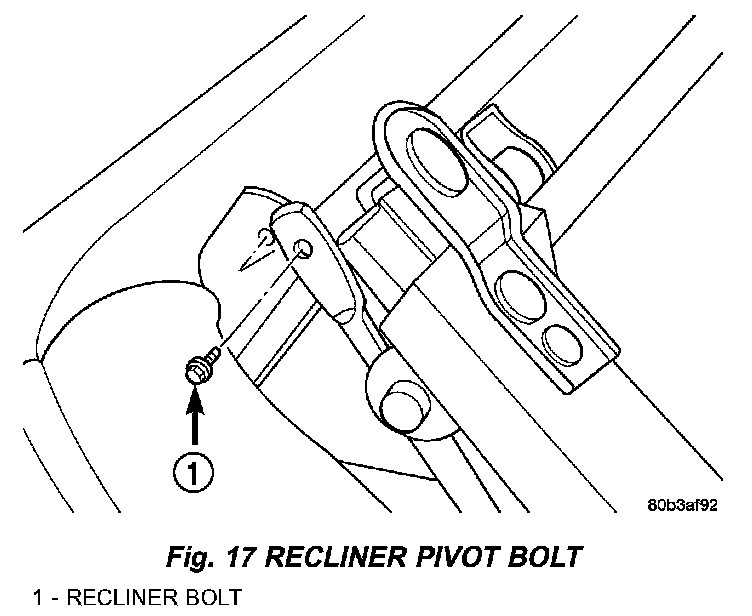 8. Install the outboard recliner attaching bolt (Fig. 17). Torque the bolt to 8 N.m (71 in.lbs.).