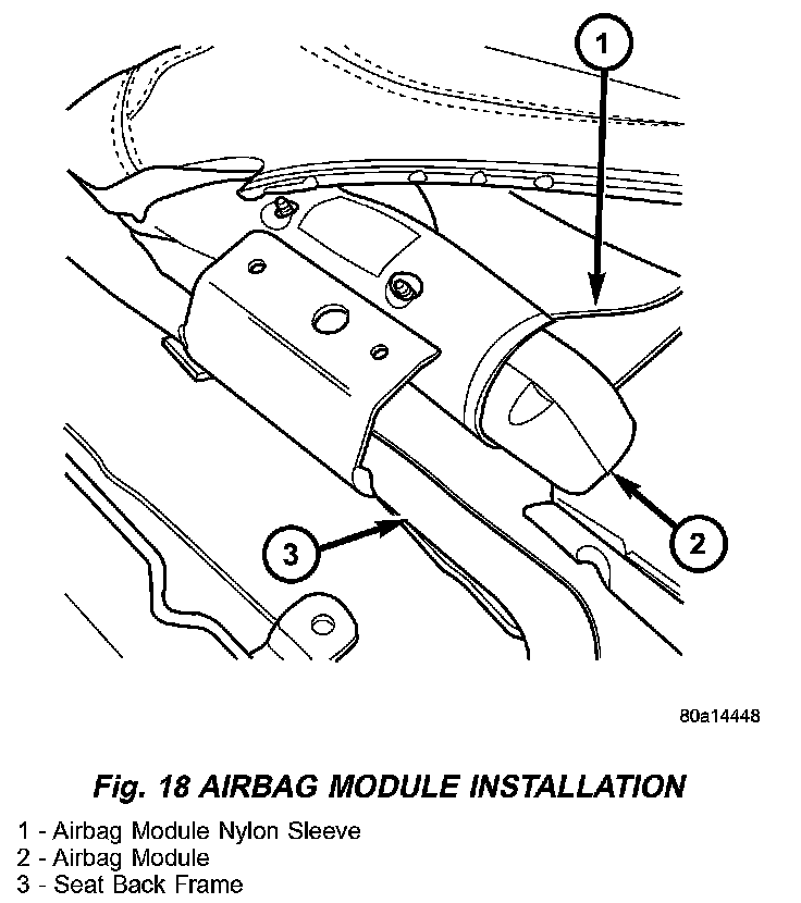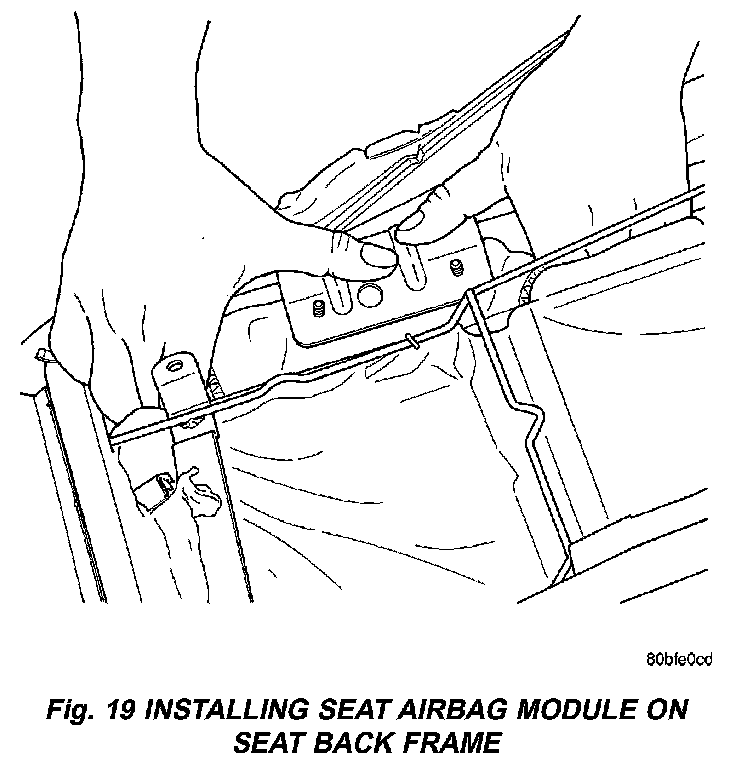 5. Carefully slide the seat airbag module in nylon sleeve (Fig. 18), install retaining nuts and plastic shield if equipped (Fig. 19). Torque the nuts to 7 N.m (62 in.lbs.).