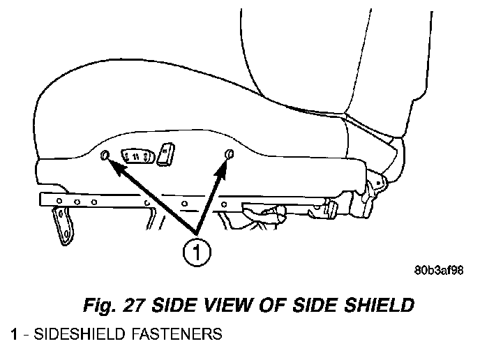 2. Remove screws attaching seat cushion side shield to the bottom and side of seat cushion (Fig. 26) and (Fig. 27).