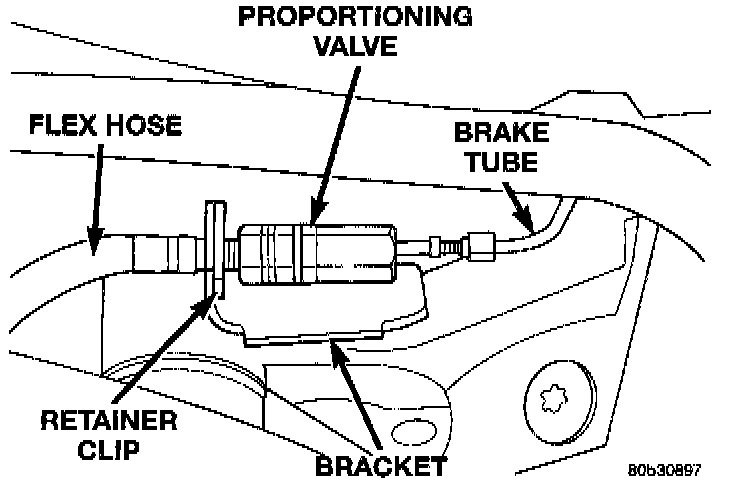 REMOVAL - PROPORTIONING VALVENOTE: This procedure applies to ABS and early production Non-ABS applications. Later production Non-ABS proportioning valves are located in the junction block. They are serviced as part of the junction block.