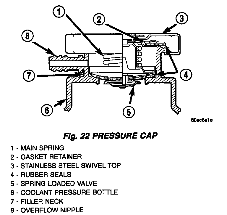 The pressure cap upper gasket (seal) pressure relief can be checked by removing cap. Attach a suitable Cooling System Tester such as Tool 7700 to the cap and pump air into the cap. Pressure cap upper gasket should relieve at 124 kPa (18 psi) and hold pressure at 110 kPa (16 psi) minimum.