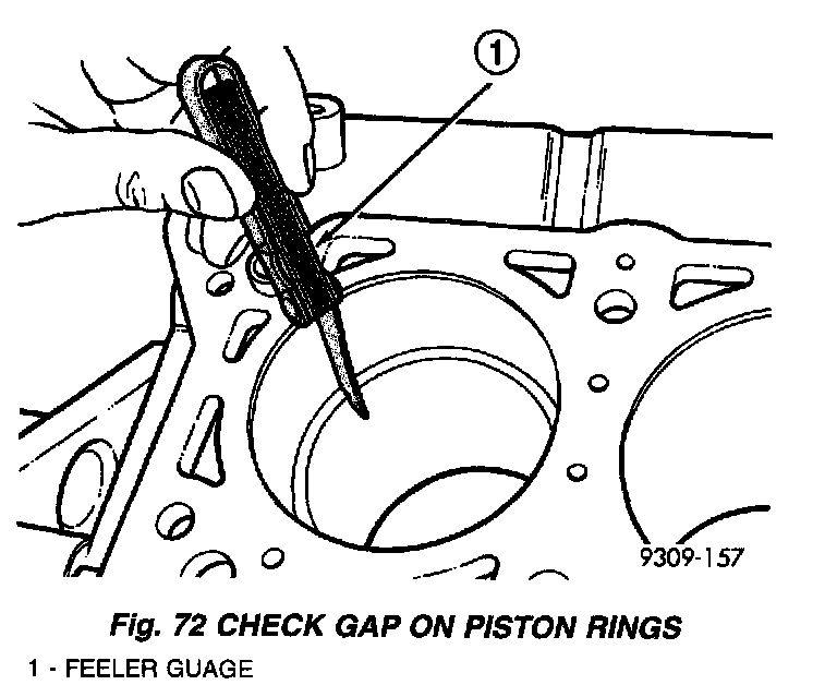 STANDARD PROCEDURE - PISTON RING FITTING1. Wipe cylinder bore clean. Insert ring and push down with piston to ensure it is square in bore. The ring gap measurement must be made with the ring positioning at least 12 mm (0.50 inch) from bottom of cylinder bore. Check gap with feeler gauge (Fig. 72). Refer to clearance measurements.