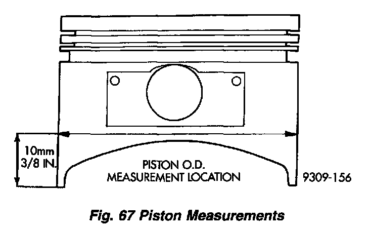 Piston and cylinder wall must be clean and dry. Piston diameter should be measured 90 degrees to piston pin at size location shown in (Fig. 67). Cylinder bores should be measured halfway down the cylinder bore and transverse to the engine crankshaft centerline. Refer to Engine Specifications. Pistons and cylinder bores should be measured at normal room temperature, 70°F (21°C).