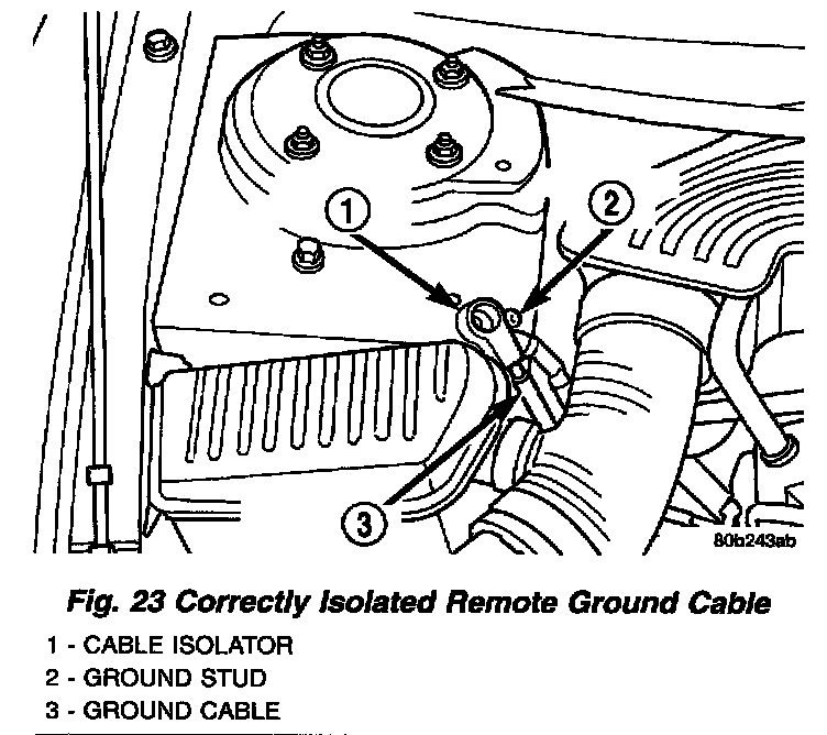 1. Remove the battery ground cable from the ground stud on the shock tower and isolate the ground cable by installing the cable isolator on the ground stud.