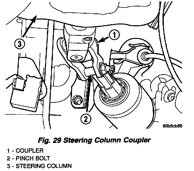 CAUTION: Before removing the steering column coupler from the intermediated steering shaft be sure the steering wheel is locked from rotating. If the steering wheel is allowed to rotate freely after it is disconnected from the intermediated shaft, the clockspring will be damaged and will need to be replaced.