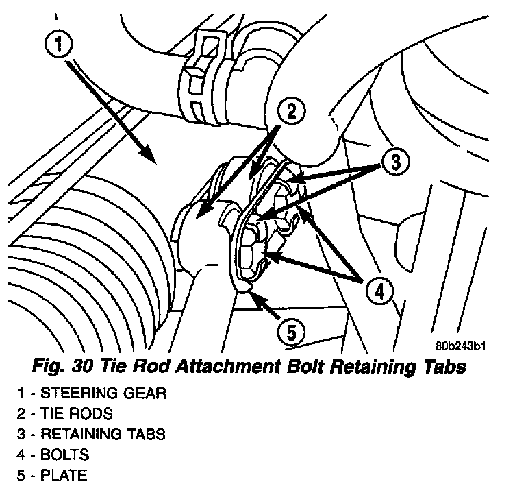 11. Bend back the retaining tabs on the mounting plate for the tie rod to steering gear mounting bolts.