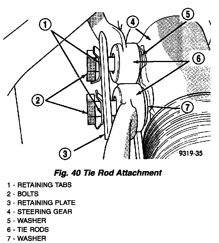 CAUTION: After tie rod attaching bolts are torqued, bend retaining plate tabs against heads of attaching bolts.