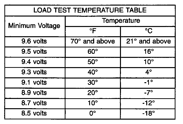 6. The voltage drop will vary with the battery temperature at the time of the load test. The battery temperature can be estimated by using the ambient temperature during the past several hours. If the battery has been charged, boosted, or loaded a few minutes prior to the test, the battery will be somewhat warmer. See the Load Test Temperature Table for the proper loaded voltage reading.