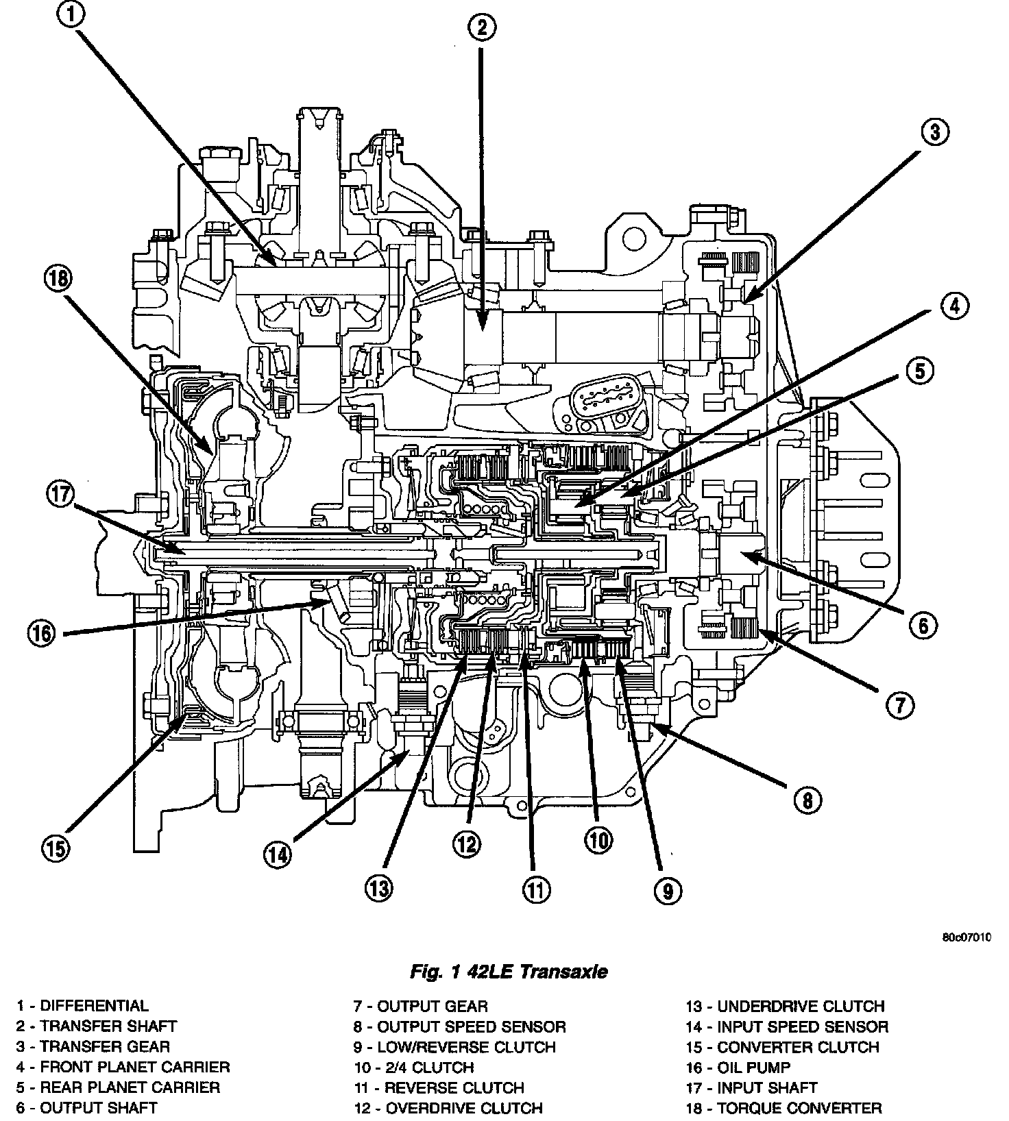 DESCRIPTIONThe 42LE (Fig. 1) is a four-speed transaxle that is a conventional hydraulic/mechanical assembly with an integral differential, and is controlled with adaptive electronic controls and monitors. The hydraulic system of the transaxle consists of the transaxle fluid, fluid passages, hydraulic valves, and various line pressure control components. An input clutch assembly, which houses the underdrive, overdrive, and reverse clutches are used. It also utilizes separate holding clutches: 2nd/4th gear and Low/Reverse. The primary mechanical components of the transaxle consist of the following: