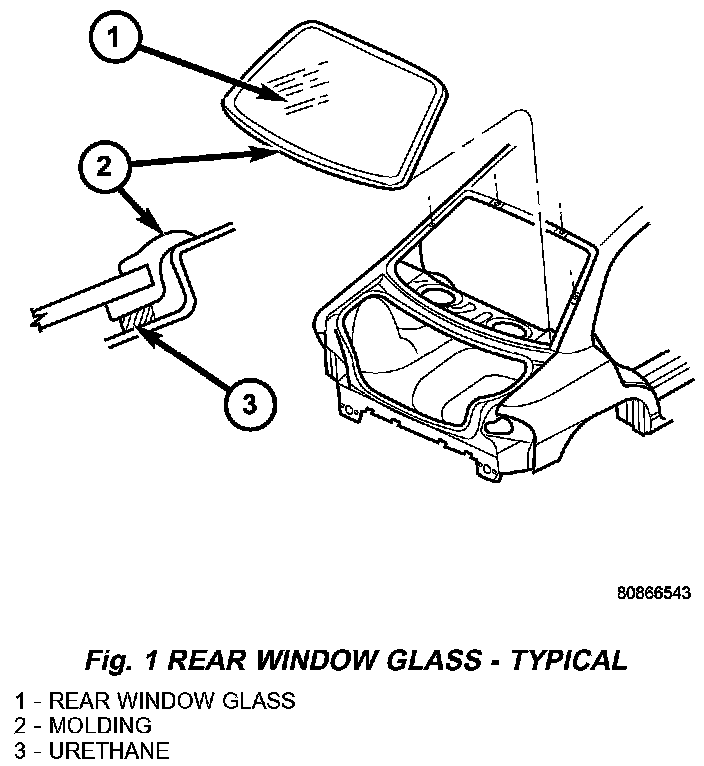 8. Slowly lower rear window glass to the roof fence opening and engage over the two flanges located on the roof fence. Guide the encapsulation into proper position as necessary. Push rear window inward until flush to roof line and C-pillars (Intrepid).