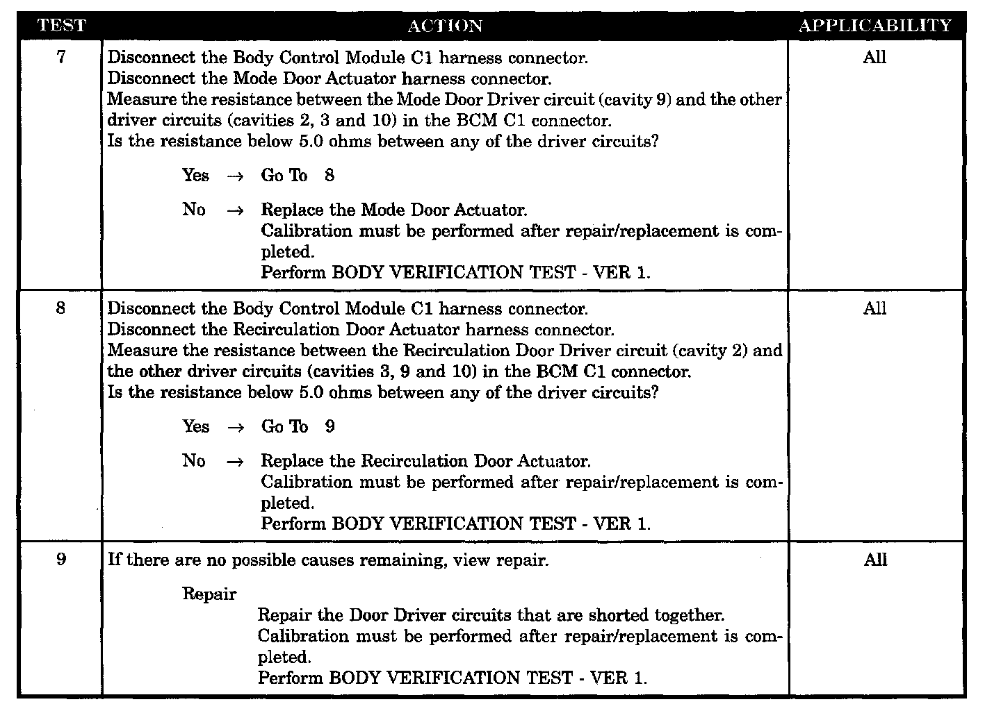 When the BCM detects one or more of the following outputs shorted to battery: mode door driver, blend door driver, recirculation door driver or the common door driver. (NOTE: all shorted to battery codes will be set when one output is shorted.