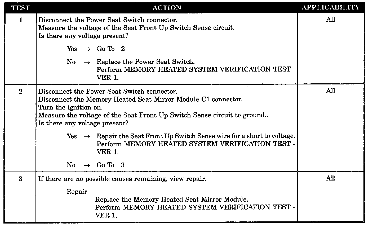 If the seat switch is active for 30 seconds, this code will set and the MHSMM will ignore the input until the state has changed. Once the stuck condition is removed, the seat will resume to normal operation. Code will remain for 20 ignition cycles.