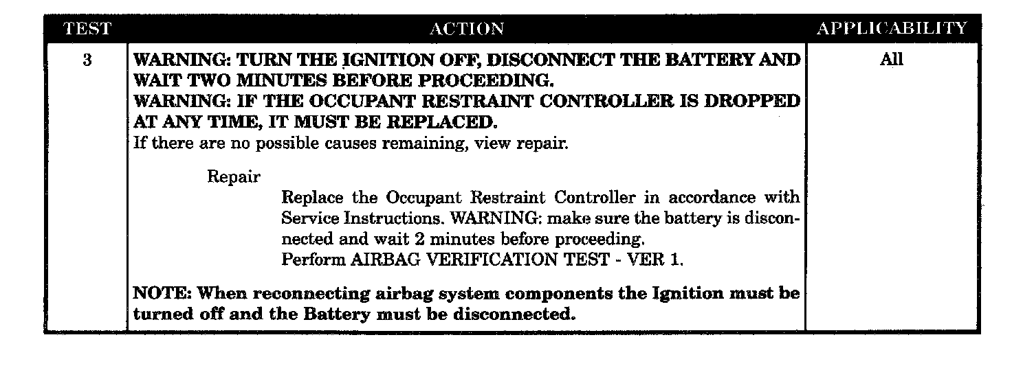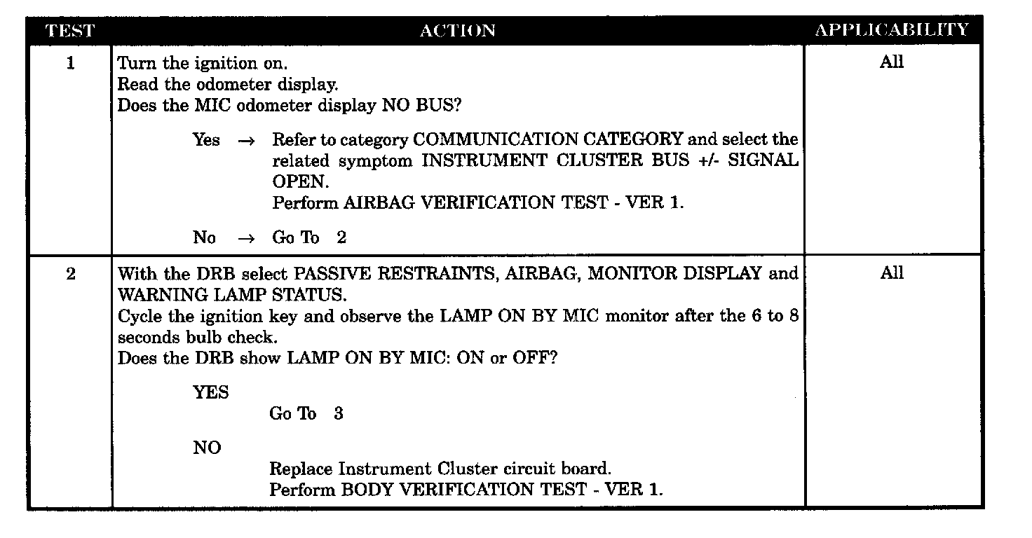 With the ignition in the ON position, the ORC monitors the PCI Bus for a message from the MIC containing the airbag warning lamp status. The MIC transmits the message one time at ignition ON, lamp state change, or in response to the ORC lamp message.