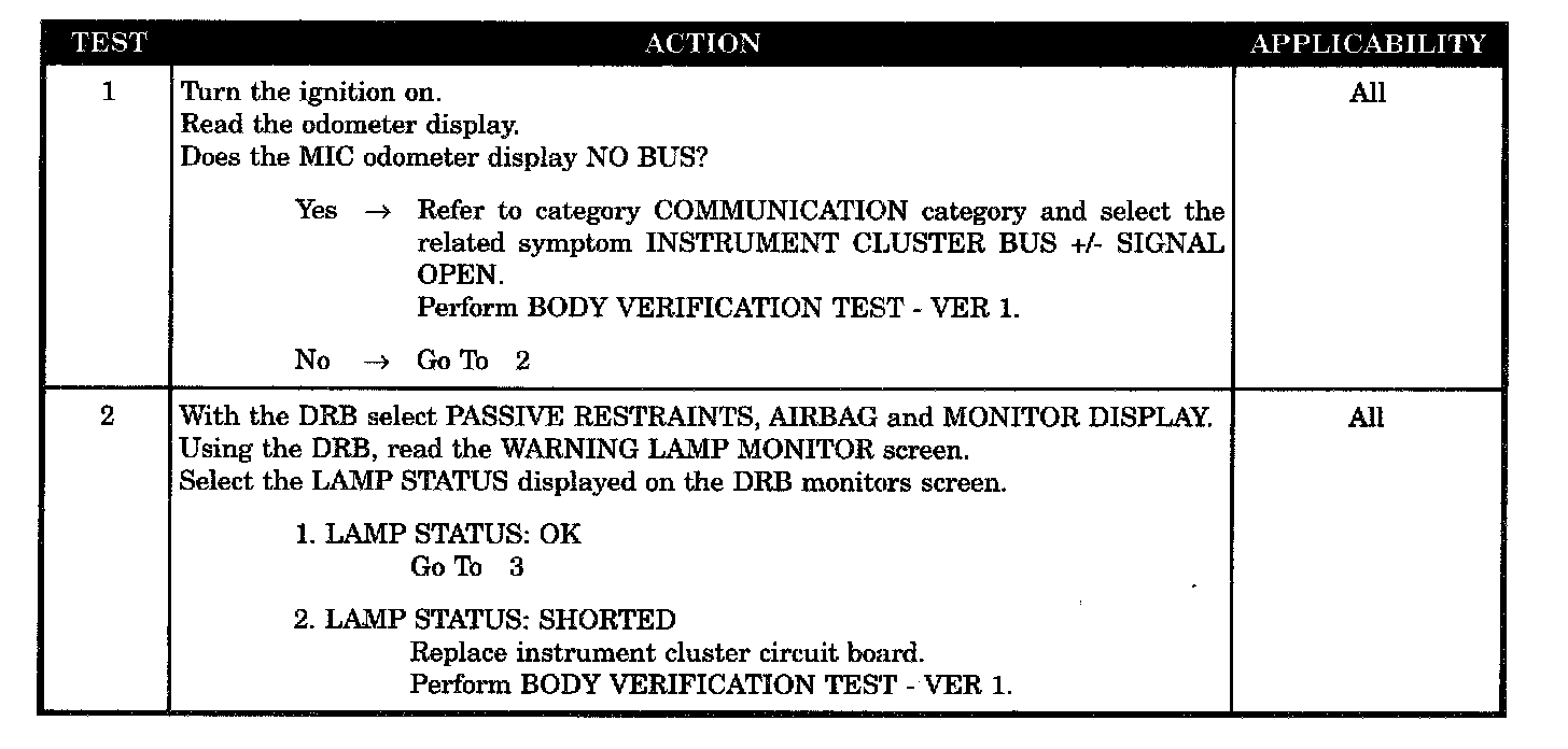 When the ignition is ON, the ORC monitors the PCI Bus for a message from the MIC containing the airbag warning lamp status Ok or Shorted. The MIC transmit the message one time at ignition ON, upon lamp state change,or in response to the ORC lamp message.