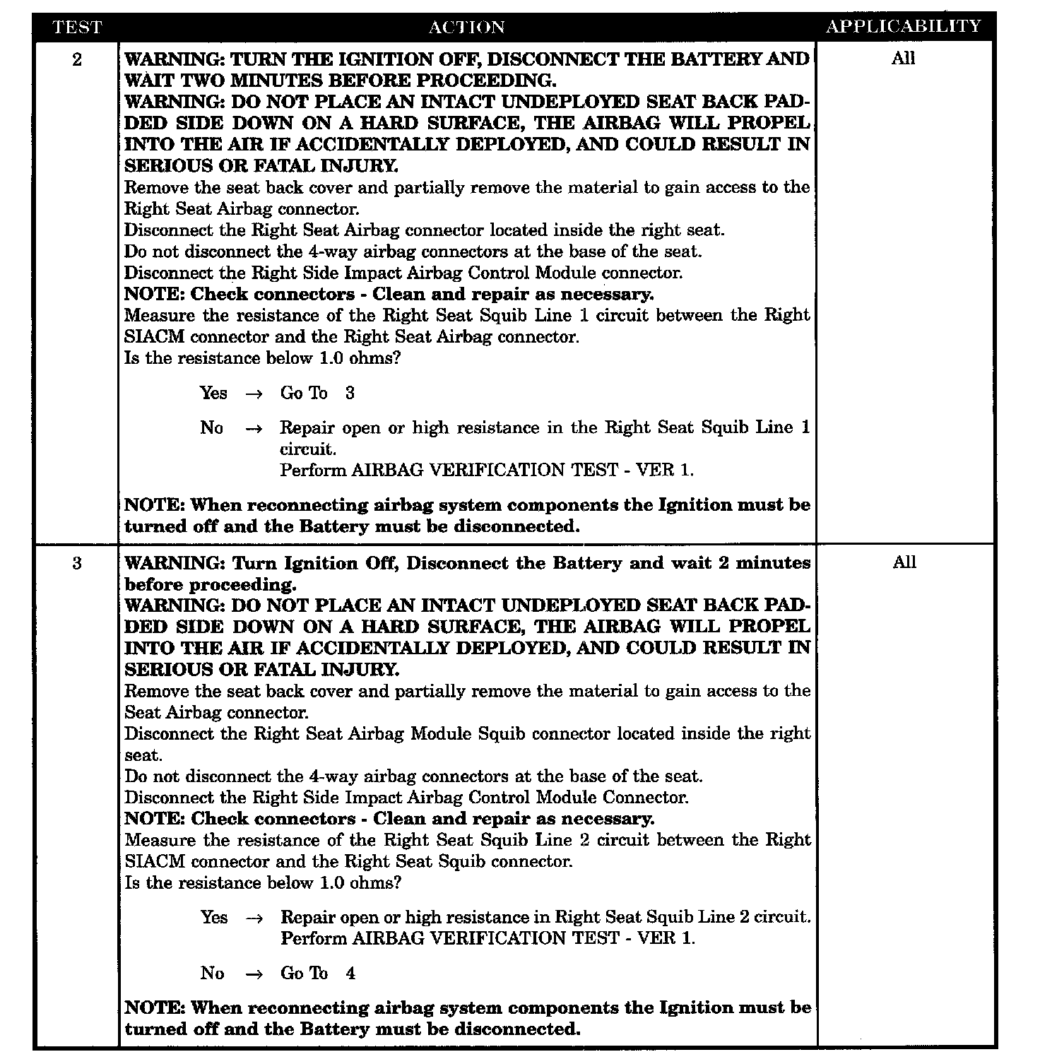 With the ignition is ON, the Right SIACM monitors the resistance of the Right Seat Squib circuits.