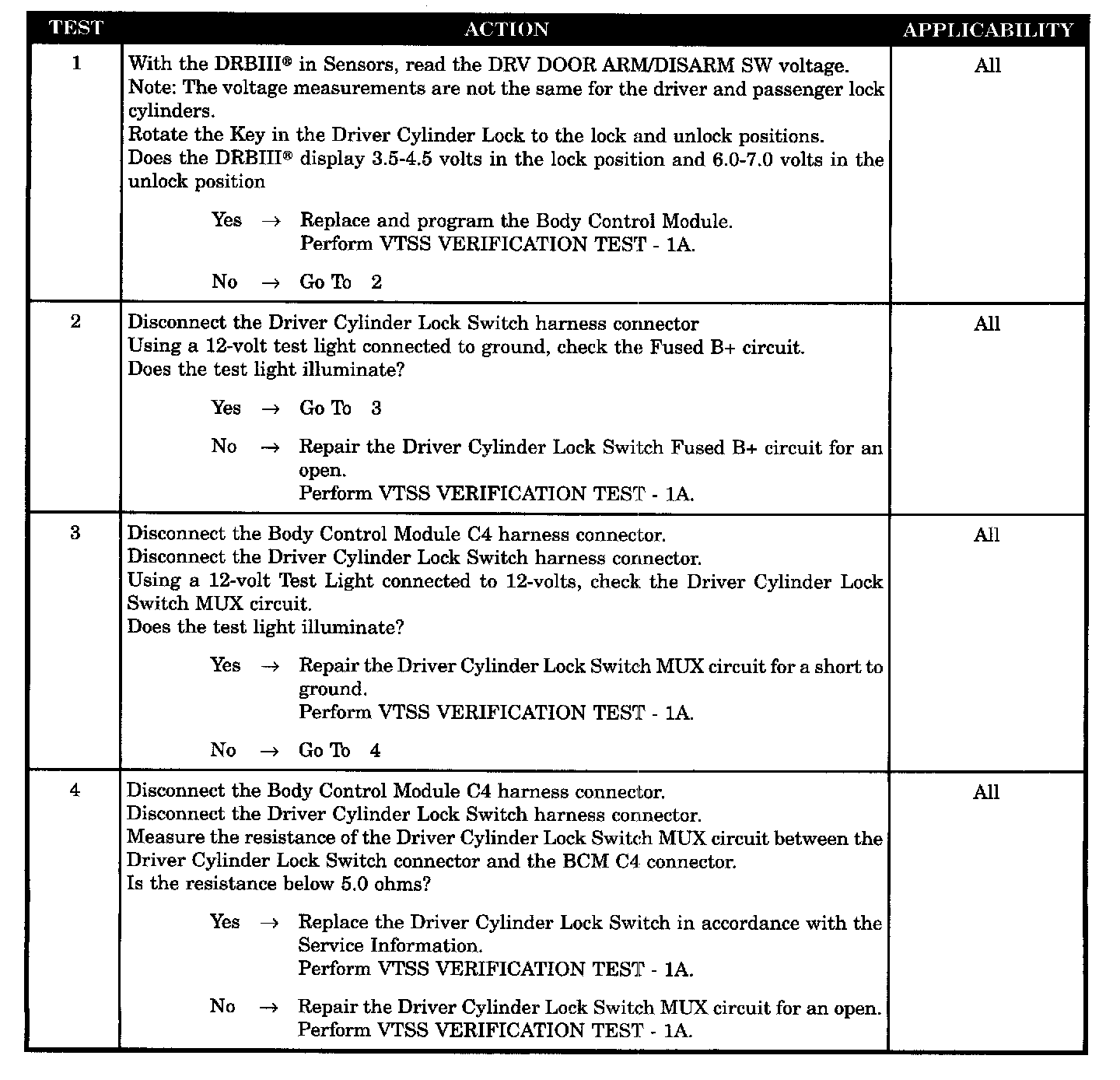 DRIVER DOOR KEY FAILS TO ARM OR TO DISARM VTSS