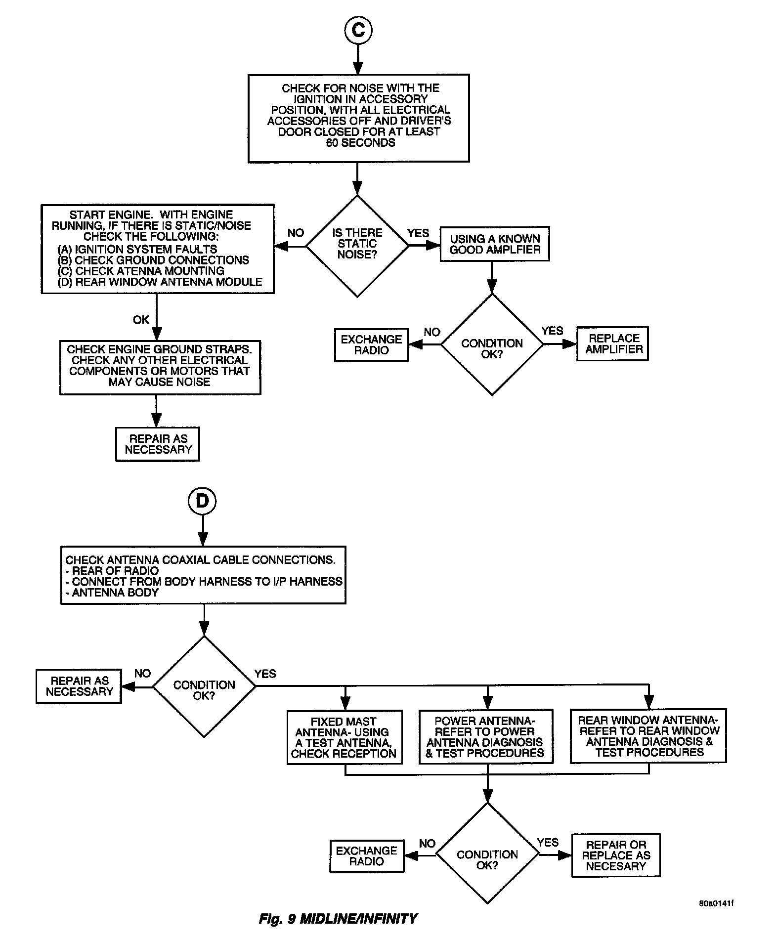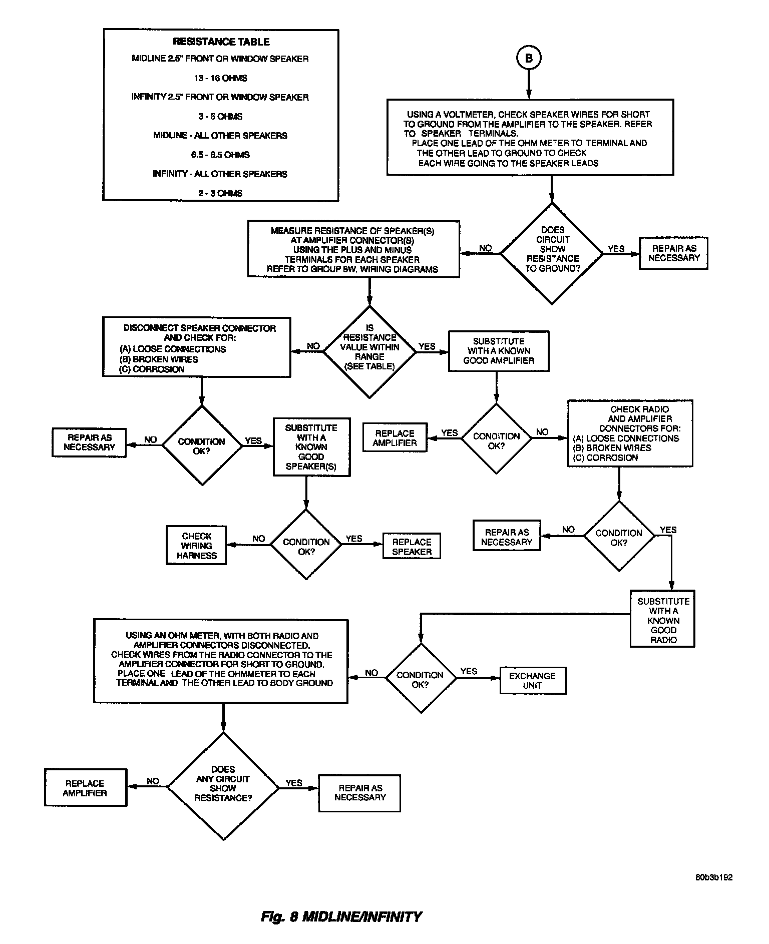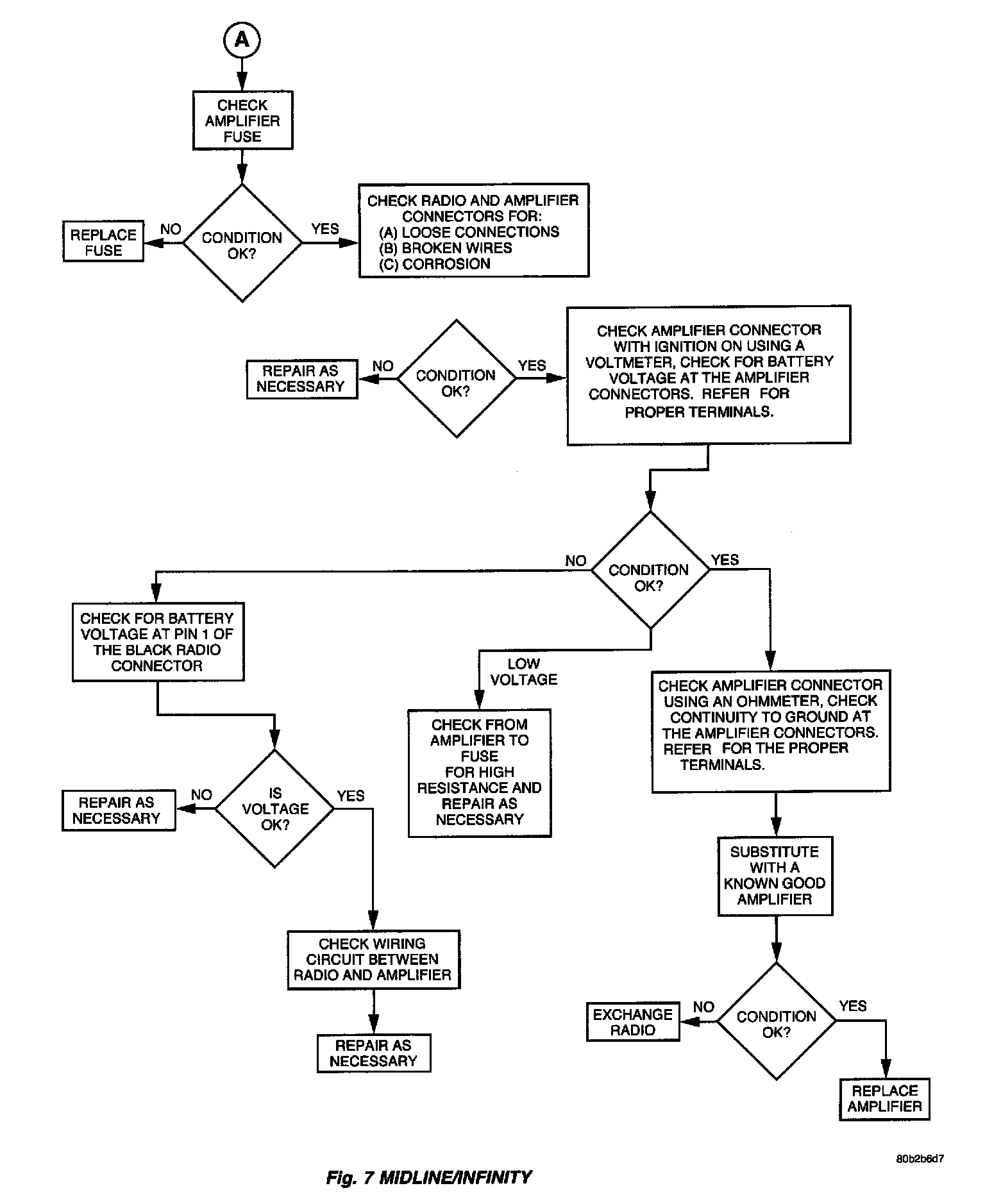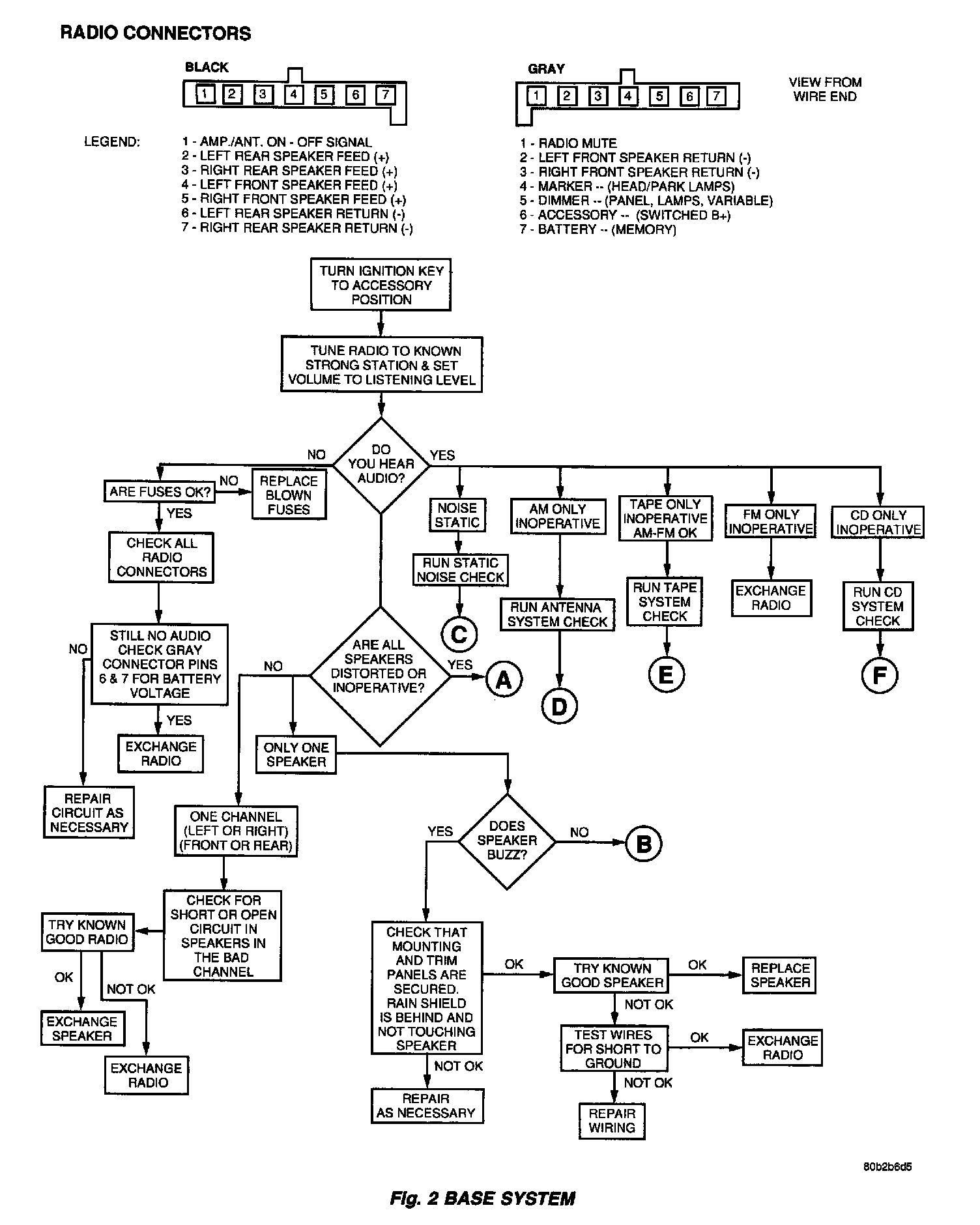 Verify, the radio wire harness is properly connected before starting normal diagnosis and repair procedures. Refer to Audio Diagnostic Tables,,, for the base system and,,,,, for the Midline/Infinity System and/or Wiring Diagrams.