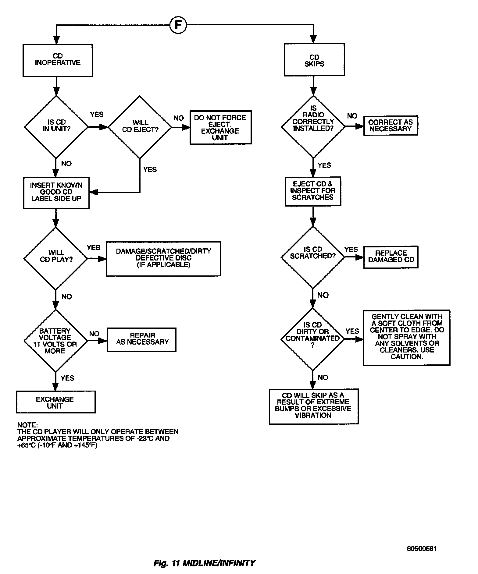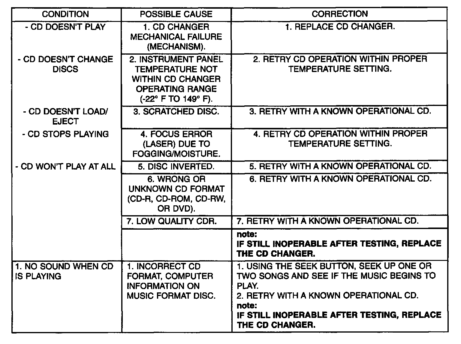 CAUTION: The CD player will only operate between approximate temperatures of -23 °C and +65 °C (-10 °F and +145 °F).Whenever a radio malfunction occurs;