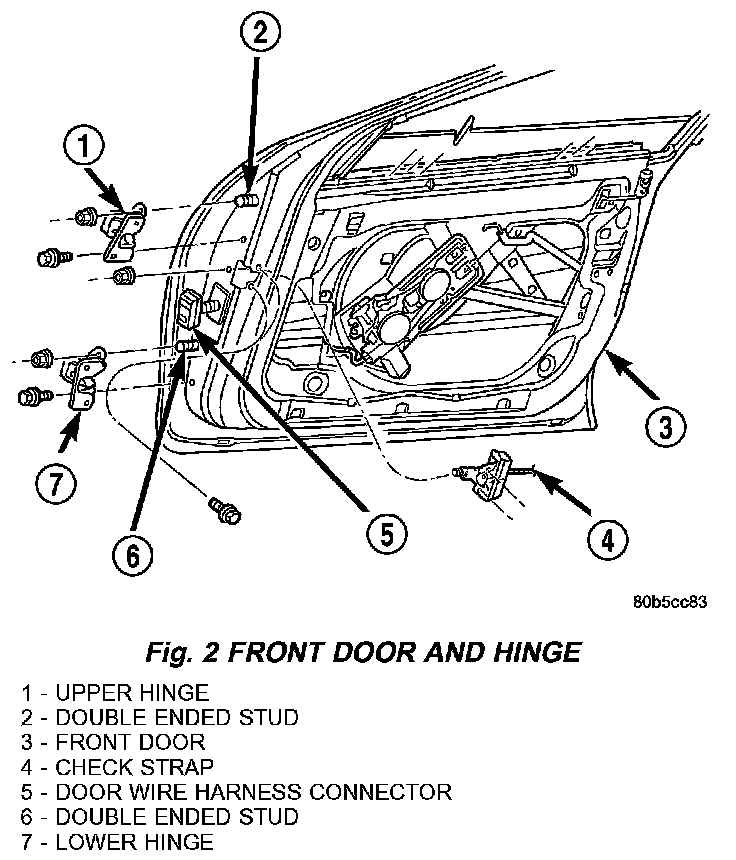 9. Remove bolt and nut attaching lower hinge to door end frame (Fig. 2).