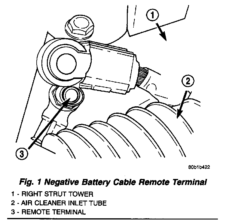 1. Open hood and disconnect the negative battery cable remote terminal from the remote battery post (Fig.1).