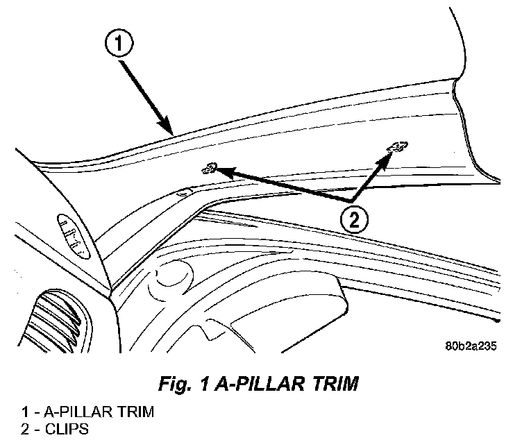 2. Disengage clips attaching trim to A-pillar by pulling on trim (Fig. 1).