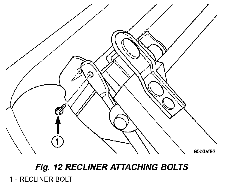 3. Install bolts attaching recliner to seat back frame (Fig. 12). Tighten bolts to 8 N.m (71 in.lbs.) torque.