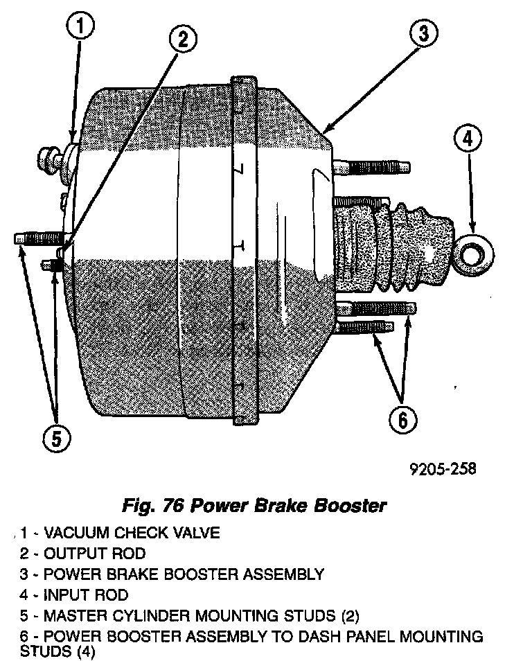 DESCRIPTIONThe power brake booster assembly mounts on the engine side of the dash panel. It is externally connected to the brake pedal by an input push rod extending out the rear of the booster. The master cylinder is bolted to the front of the power brake booster assembly.