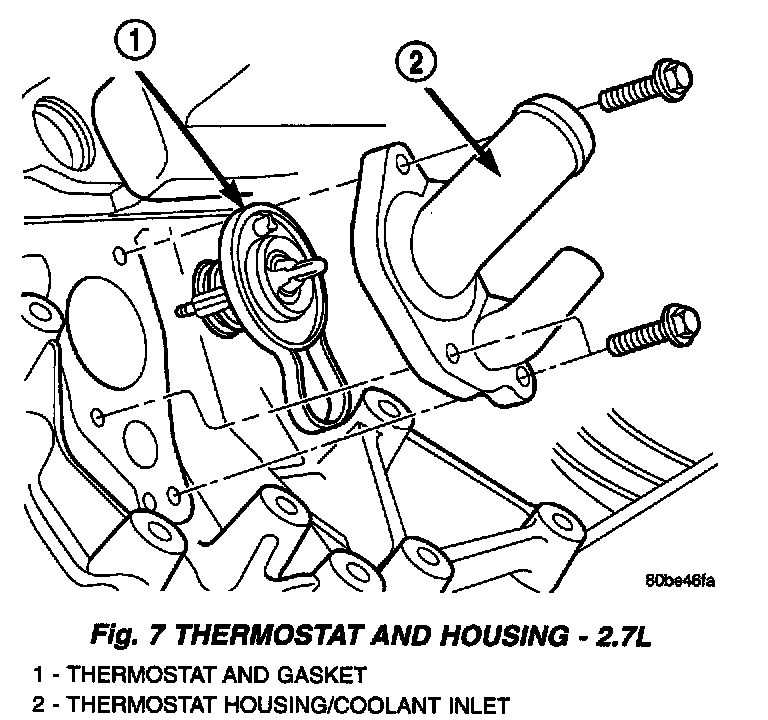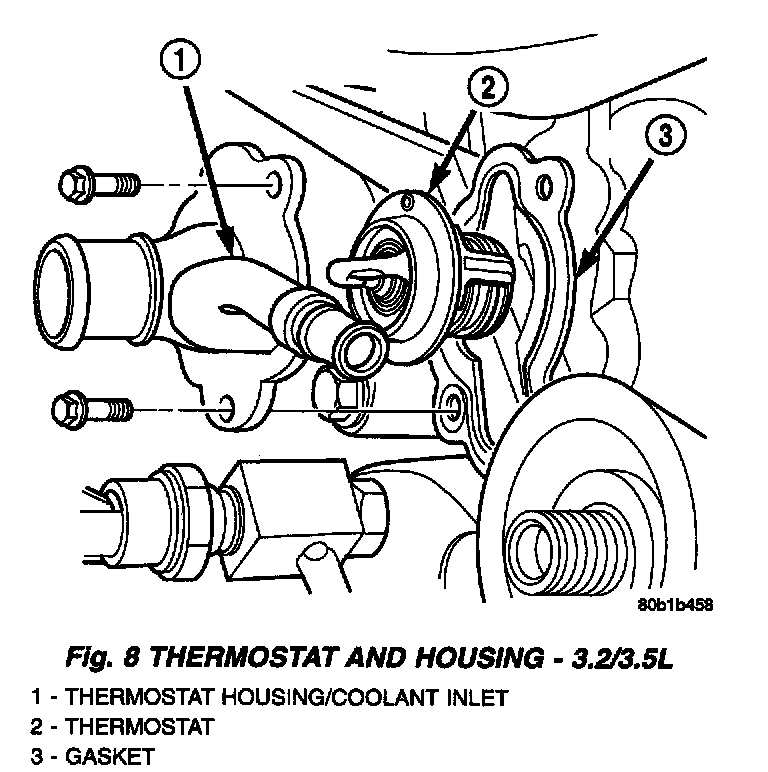 DESCRIPTIONThe thermostat on the 2.7L and 3.2/3.5L engines are located on the lower left side of engine, near the front and. The thermostat on both engines are on the inlet side of the water pump. The thermostats have an air bleed located in the thermostat flange. The air bleed allows internal trapped air during cooling system filling to be released.