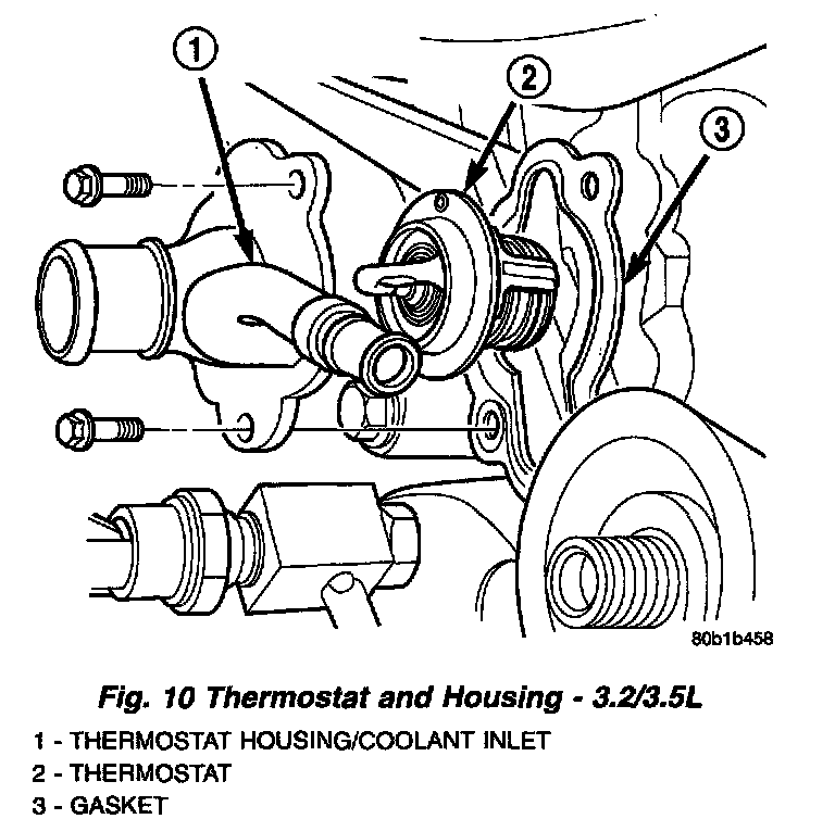 2. Install thermostat and gasket into thermostat housing. For ease of installation, install bolts in housing for thermostat and gasket retention.