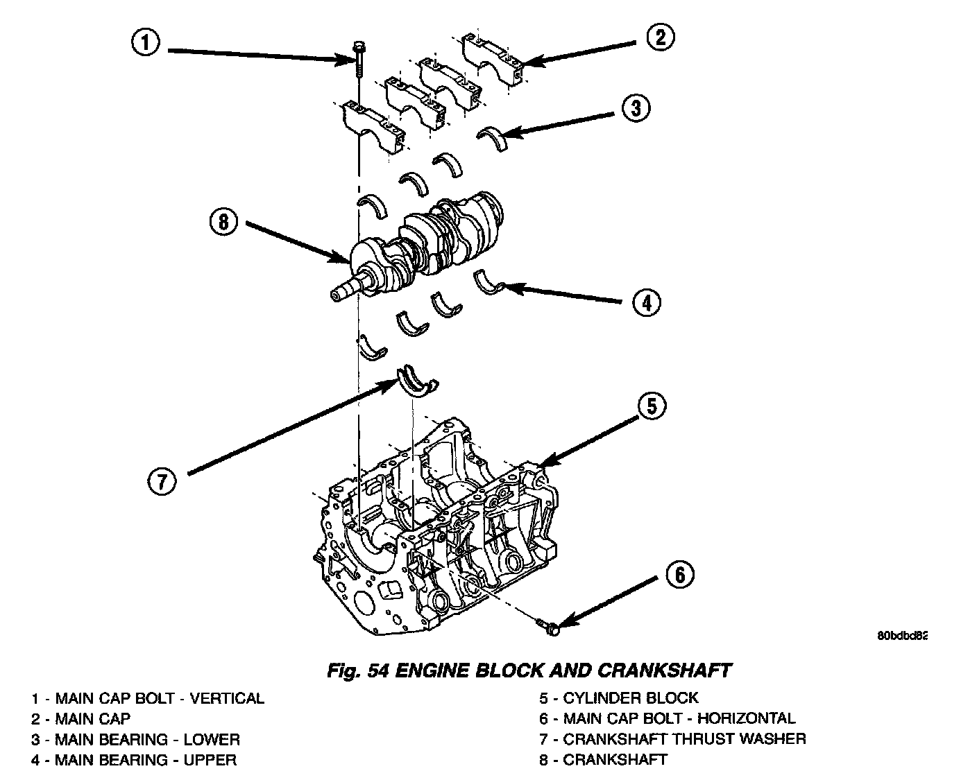 DESCRIPTIONThe cylinder block (Fig. 54) is made of heat treated aluminum with cast-in-place iron liners. The block is a closed deck design with the right bank forward. To provide high rigidity and improved NVH, the block has cast-in contours and ribs, along with powdered metal 6 bolt main caps (4 vertical, 2 horizontal), with a die cast aluminum structural beam windage tray mounted to the main caps.
