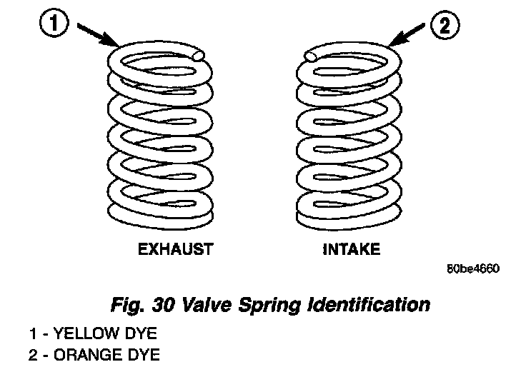 4. Place valve springs (color-coded end facing up (Fig. 30)) and valve retainers into position on spring seat (Fig. 31).