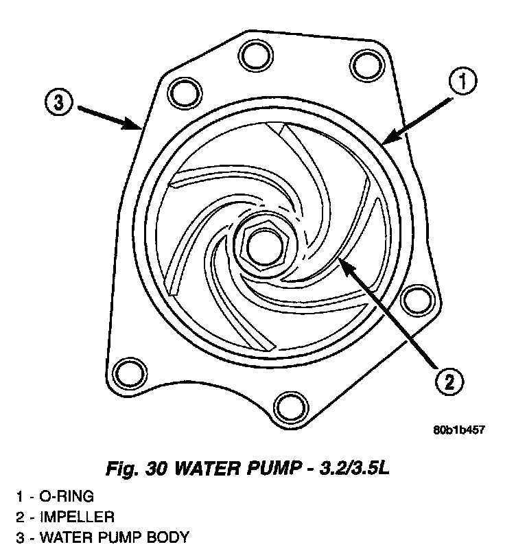 NOTE: It is normal for the water pump to weep a small amount of coolant from the weep hole (black stain on water pump body). Do not replace the water pump if this condition exists. Replace the water pump if a heavy deposit or a steady flow of engine coolant is evident on water pump body. This indicates a shaft seal failure and pump must be replaced. Be sure to perform a thorough analysis before replacing water pump.
