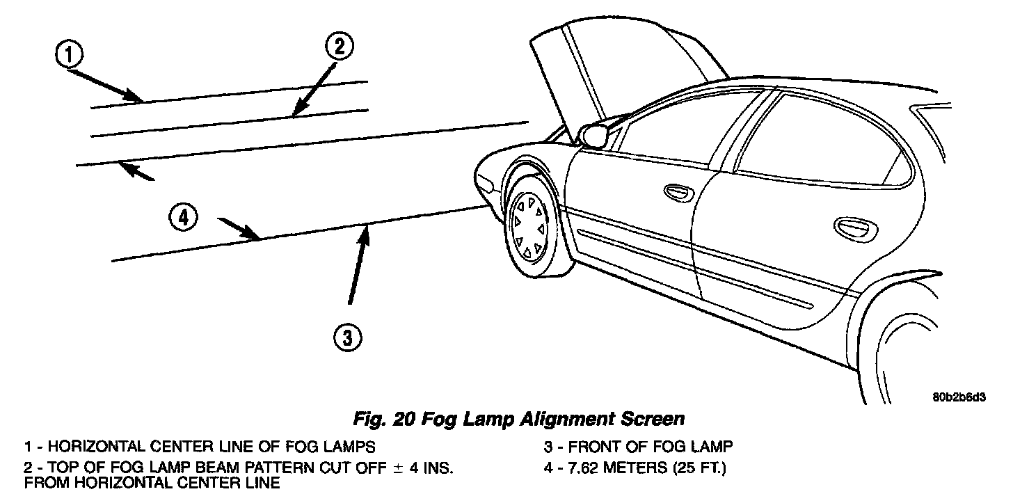 Prepare an alignment screen. Refer to Electrical, Lamps/Lighting - Exterior, Headlamp, Adjustments for Alignment Screen Preparation. A properly aligned fog lamp will project a pattern on the alignment screen 100 mm (4 in.) below the fog lamp center line and straight ahead. To adjust fog lamp alignment, rotate the alignment screw.