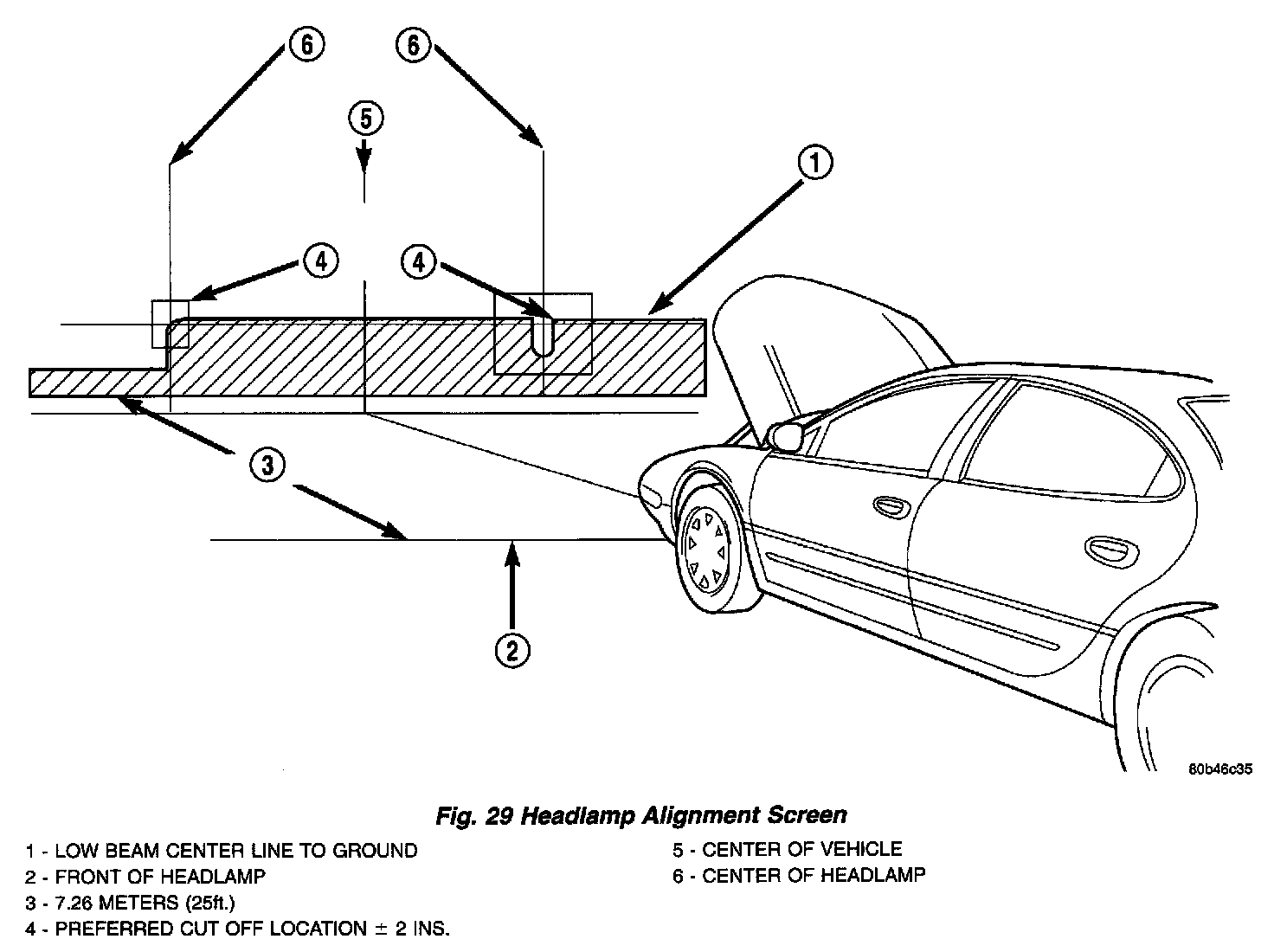 7. Measure distance from the center line of the vehicle to the center of the headlamp bulbs, or refer to Headlamp Alignment Measurement Table. Transfer measurements to screen (with tape) to each side of vehicle center line. Use these lines for left/right adjustment reference (Fig. 29).
