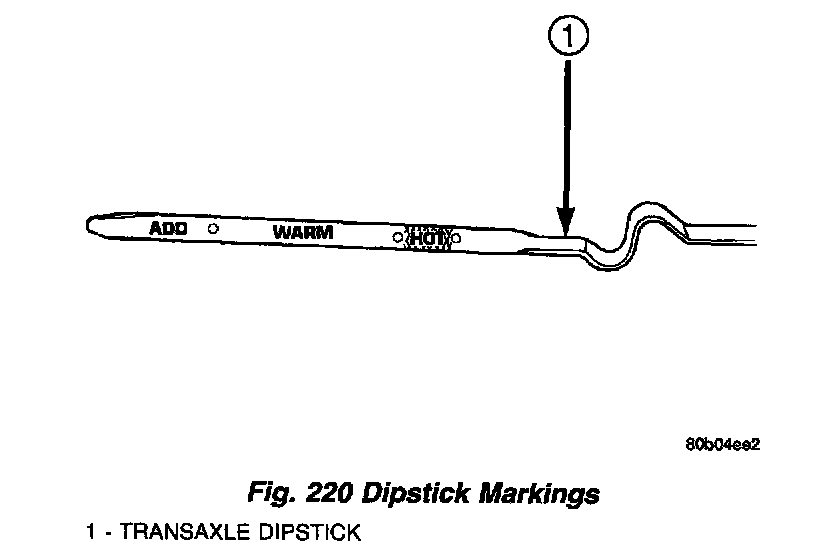 The torque converter fills in both the P Park and N Neutral positions. Place the selector lever in P Park to be sure that the fluid level check is accurate. The engine should be running at idle speed for at least one minute, with the vehicle on level ground. At normal operating temperature (approximately 82°C or 180°F), the fluid level is correct if it is in the HOT region (cross-hatched area) on the oil level indicator (Fig. 220). The fluid level should be in the proximity of the lower hole of the dipstick at 70°F fluid temperature. Adjust fluid level as necessary. Use only Mopar ATF +4 AUTOMATIC Transmission Fluid (MS 9602).