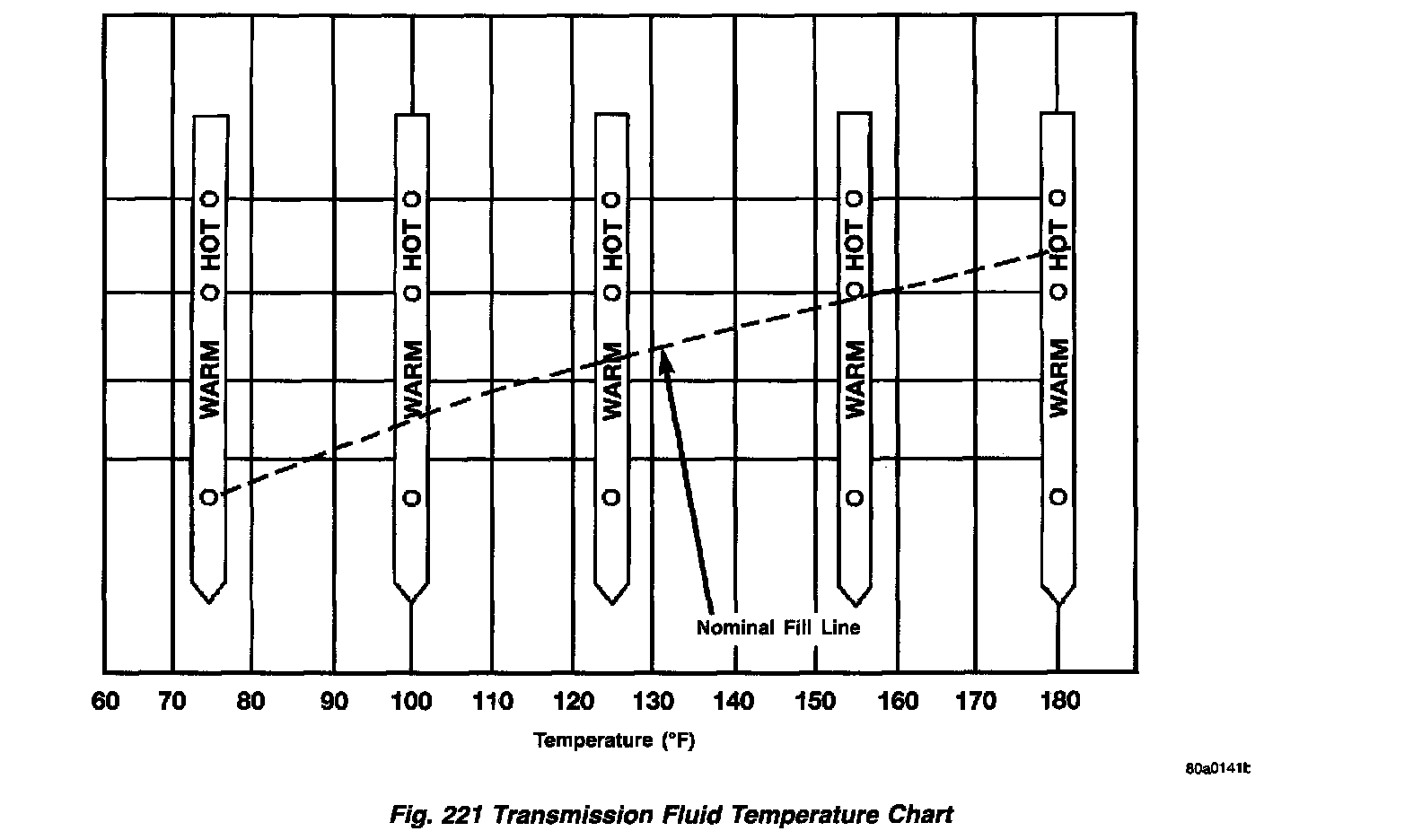 (6) Adjust transmission fluid level shown on the dipstick according to the chart (Fig. 221). Use only Mopar ATF +4 AUTOMATIC Transmission Fluid (MS 9602).