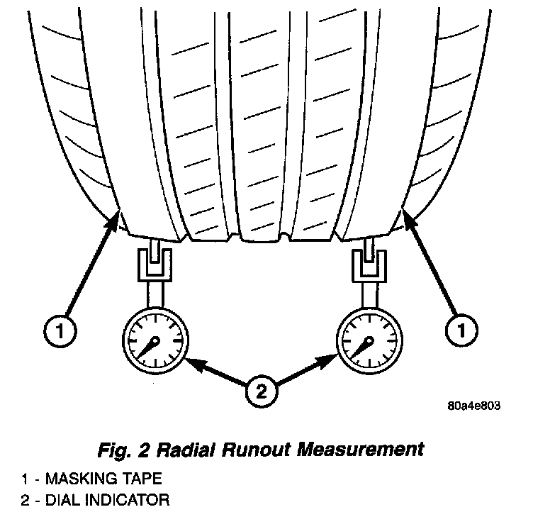 c. Check system runout using Dial Indicator Set, Special Tool C-3339A with 25-W wheel, or equivalent. Place the end of the indicator against each taped area (one at a time) and rotate the tire and wheel. System radial runout should not exceed 0.76 mm (0.030 inch) with no tread "dips" or "steps." Tread "dips" and "steps" can be identified by spikes of the dial indicator gauge.