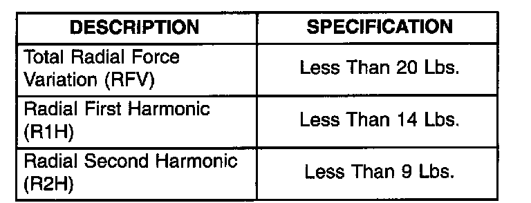 Radial Forces can be checked using the Hunter GSP 9700 Vibration Control System (Wheel Balancer) or equivalent, if available. Use the following reference values for measuring assembly radial forces when diagnosing vibration complaints: