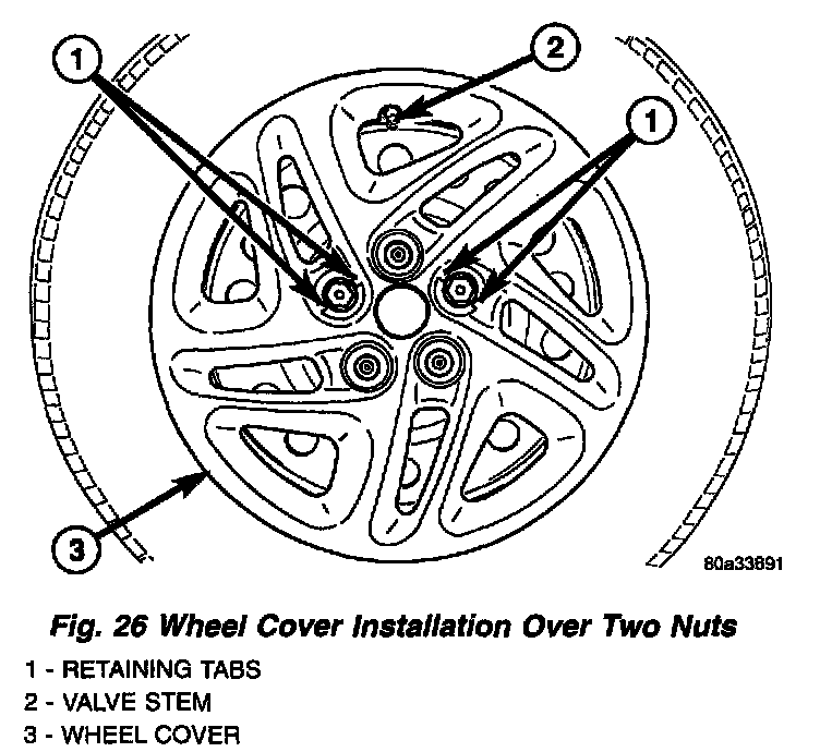 c. Press in on center of wheel cover until wheel cover retaining tabs push past and engage rear of previously installed wheel mounting nuts. This will hold the wheel cover in place.