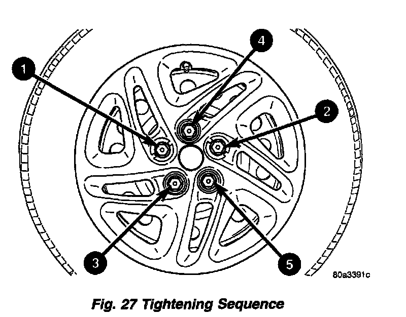 3. Tighten all five wheel mounting nuts in the proper sequence. Tighten wheel nuts to a torque of 135 Nm (100 ft. lbs.).