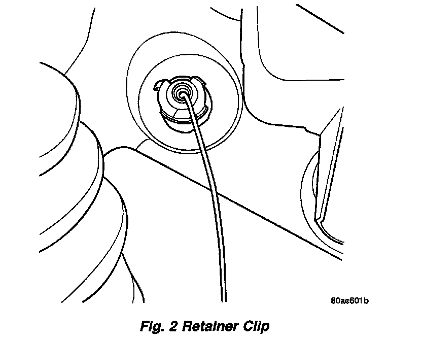 2. From inside the vehicle, hold up the pedal and remove the cable retainer and throttle cable from the upper end of the pedal shaft (Fig. 1) and (Fig. 2).