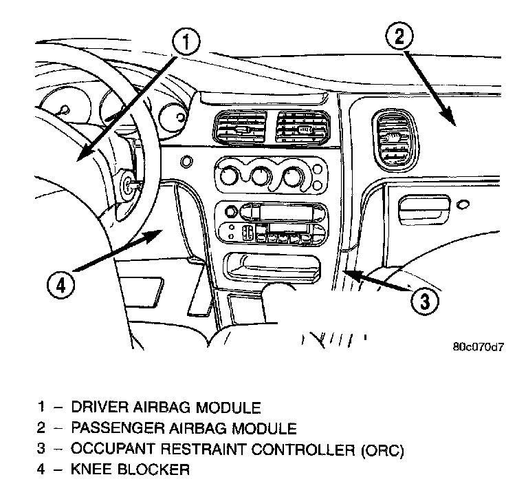 WARNING: THE AIRBAG SYSTEM IS A SENSITIVE, COMPLEX ELECTROMECHANICAL UNIT. BEFORE ATTEMPTING TO DIAGNOSE OR SERVICE ANY AIRBAG SYSTEM OR RELATED STEERING WHEEL, STEERING COLUMN, OR INSTRUMENT PANEL COMPONENTS YOU MUST FIRST DISCONNECT AND ISOLATE THE BATTERY NEGATIVE (GROUND) CABLE. WAIT TWO MINUTES FOR THE SYSTEM CAPACITOR TO DISCHARGE BEFORE FURTHER SYSTEM SERVICE. THIS IS THE ONLY SURE WAY TO DISABLE THE AIRBAG SYSTEM. FAILURE TO DO THIS COULD RESULT IN ACCIDENTAL AIRBAG DEPLOYMENT AND POSSIBLE PERSONAL INJURY. NEVER STRIKE OR KICK THE AIRBAG CONTROL MODULE, AS IT CAN DAMAGE THE IMPACT SENSOR OR AFFECT ITS CALIBRATION. IF AN OCCUPANT RESTRAINT CONTROLLER IS ACCIDENTALLY DROPPED DURING SERVICE, THE MODULE MUST BE SCRAPPED AND REPLACED WITH A NEW UNIT.