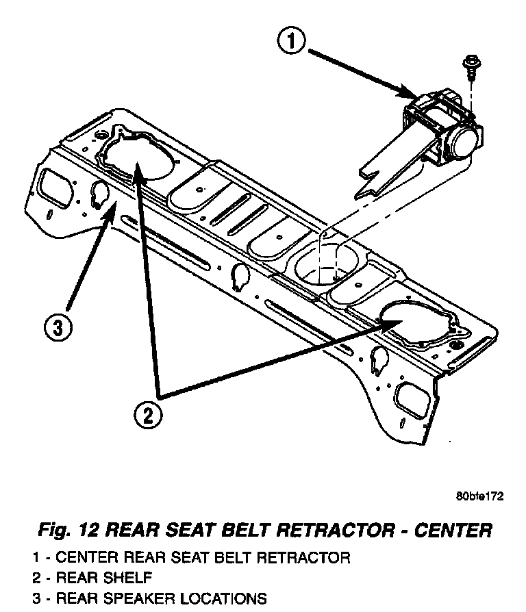 2. Remove the bolt attaching the center rear seat belt retractor to the rear shelf.