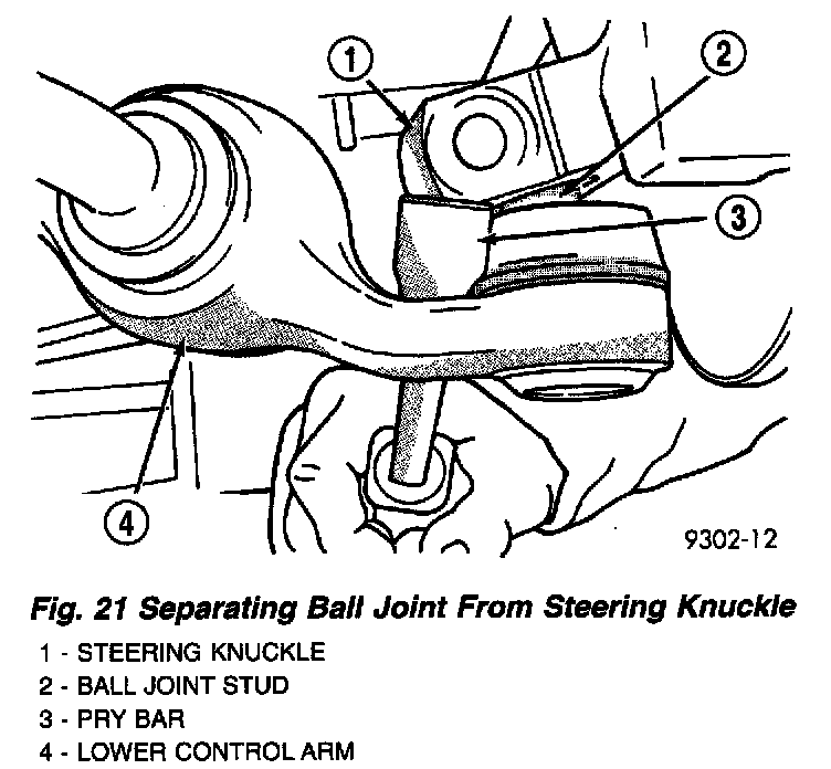 11. Carefully insert a pry bar between lower control arm and steering knuckle. Push down on pry bar to separate ball joint stud from steering knuckle.