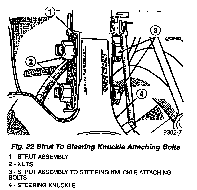 CAUTION: The strut assembly to steering knuckle bolts are serrated where they go through strut assembly and steering knuckle. When removing bolts, turn nuts off bolts DO NOT TURN BOLTS IN STEERING KNUCKLE. If bolts are turned damage to steering knuckle will result.